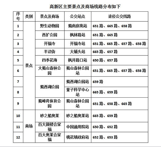 為服務(wù)好廣大市民五一假期到高新區周邊各主要景點(diǎn)游玩及高新區大型商場(chǎng)購物,高新公交匯總了高新區7個(gè)主要景點(diǎn)和3個(gè)大型商場(chǎng)公交線(xiàn)路,供市民外出時(shí)參考。