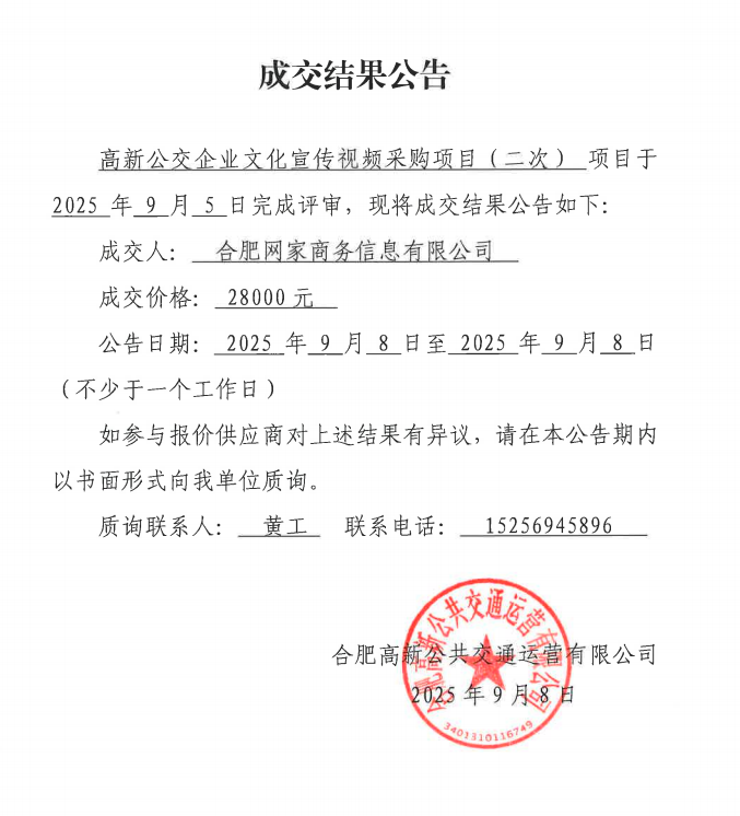 高新公交企業(yè)文化宣傳視頻采購項目(二次)成交結果公告