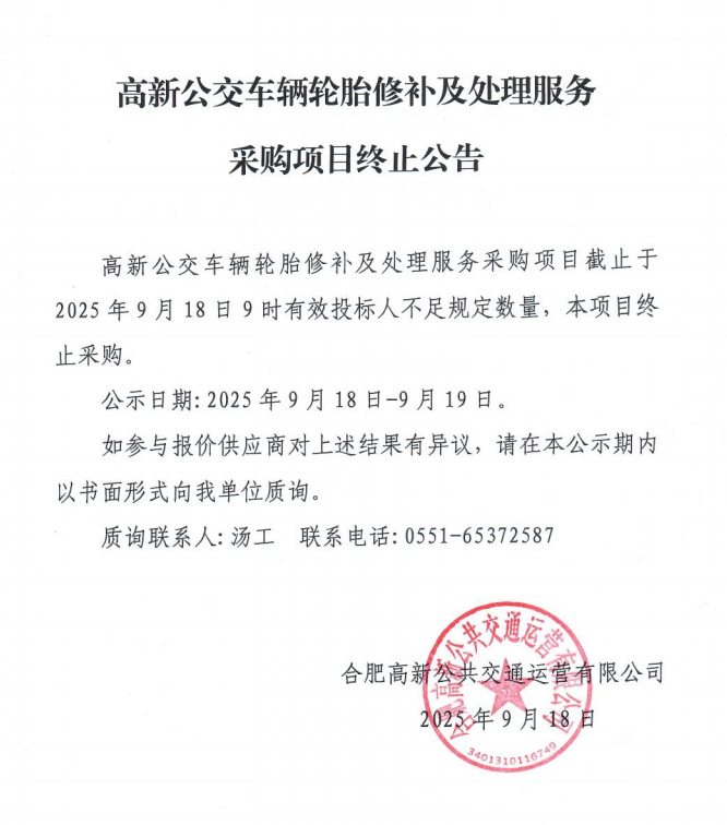 高新公交輪胎修補及處理服務(wù)采購項目終止公告